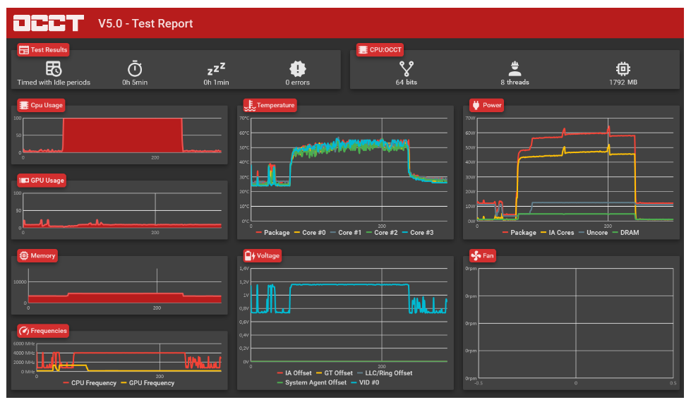 The OCCT benchmark tool also embeds the monitoring engine, providing complete readings of the computer’s internal temperature, voltage, and fan speed, and displaying both in real-time plotted graphs and by the end of the test. If you’re worried about performance with real-time graphics, don’t: although it’s very light, hiding the graphics pane alone will stop it from refreshing. The app even protects your personal computer from overheating or damage by including alarms that you could customize for every sensor: after you exceed (or under) the alarm values ​​for temperature, voltage, or fan speed, the test stops to safeguard your computer.
